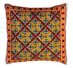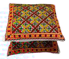 Accentuate your living spaces with these vibrant set of cushion covers, handmade by folk artisans from Gujrat, India. Elegant traditional pattern cushion covers in standard size of 16x16 inches each for daily use in living room or on the beds.
