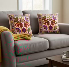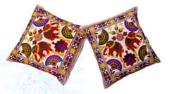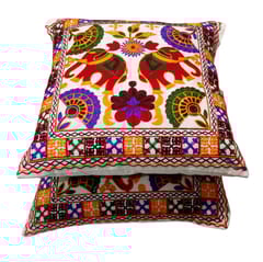 Accentuate your living spaces with these vibrant set of cushion covers, handmade by folk artisans from Gujrat, India. Elegant traditional pattern cushion covers in standard size of 16x16 inches each for daily use in living room or on the beds.