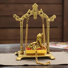Gold finish metal swing (jhula) with Bala Krishna in Mahkan Chor depiction for home temple or for use as a decorative accent.